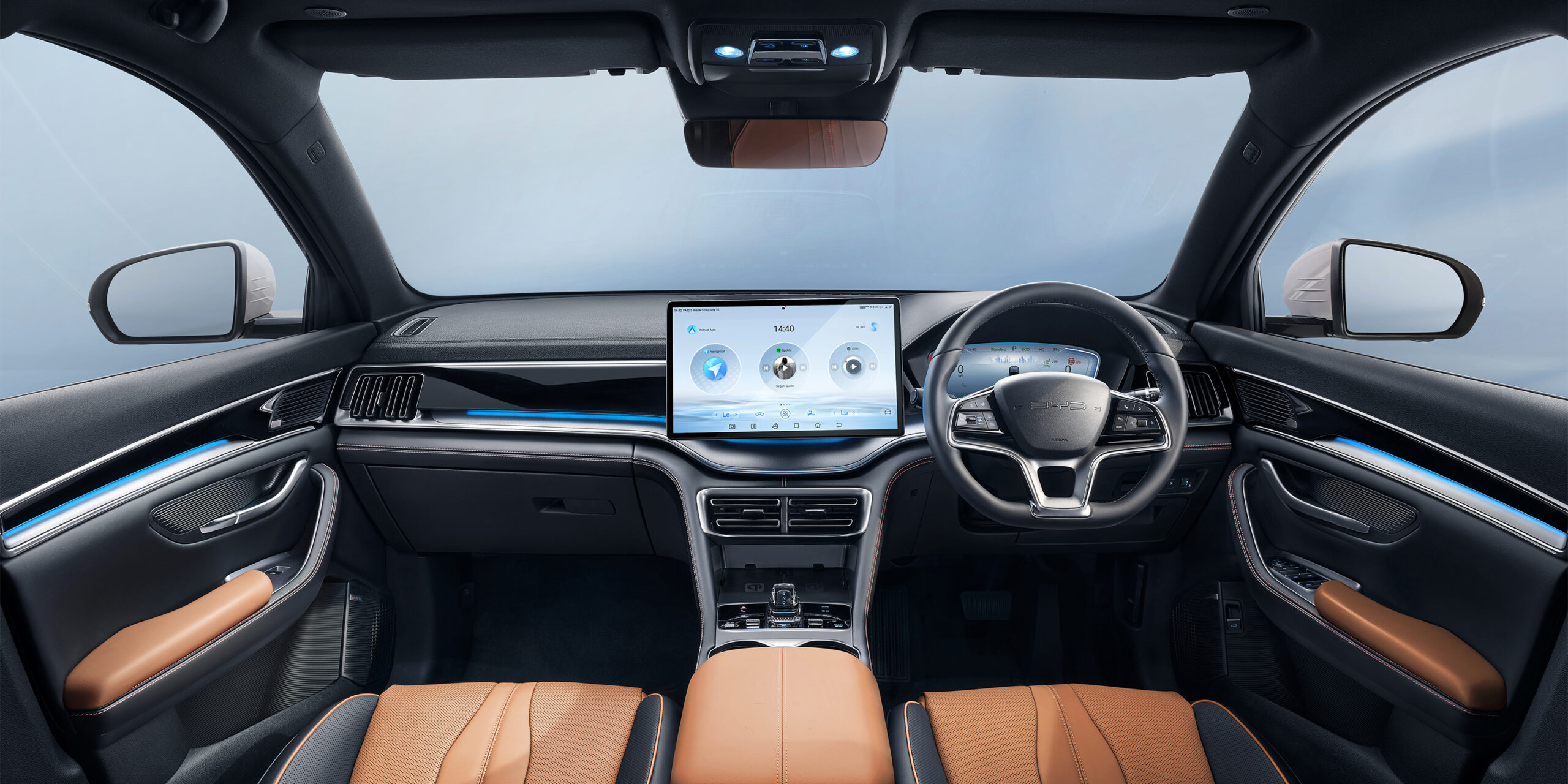 Nội thất của BYD SEALION 6 có thiết kế mang phong cách tương lai, nổi bật với bảng điều khiển trung tâm nổi có ngăn chứa đồ hai tầng kết hợp giữa tính thực dụng và sự thanh lịch.